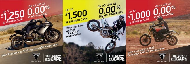 We are your authorized dealer for Triumph, CFMOTO and Argo Our award winning all-terrain vehicles have the power to conquer, to go further and experience more. Explore rocky creek beds, colossal mud pits, wooded mountainsides, bush and farmer fields. Our lineup of high performance vehicles rip through the toughest terrain with ease! No matter what you’re looking for, we’ve got something for you. Our knowledgeable staff welcomes you to our family and will ensure a great riding experience and a ton of fun. Come see us today!