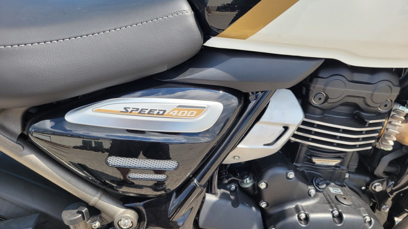 Trademark black powder-coated engine casings, tough gold anodized forks, high-quality paint, and exquisite detailing ensure the finish on the Speed 400 is premium throughout.