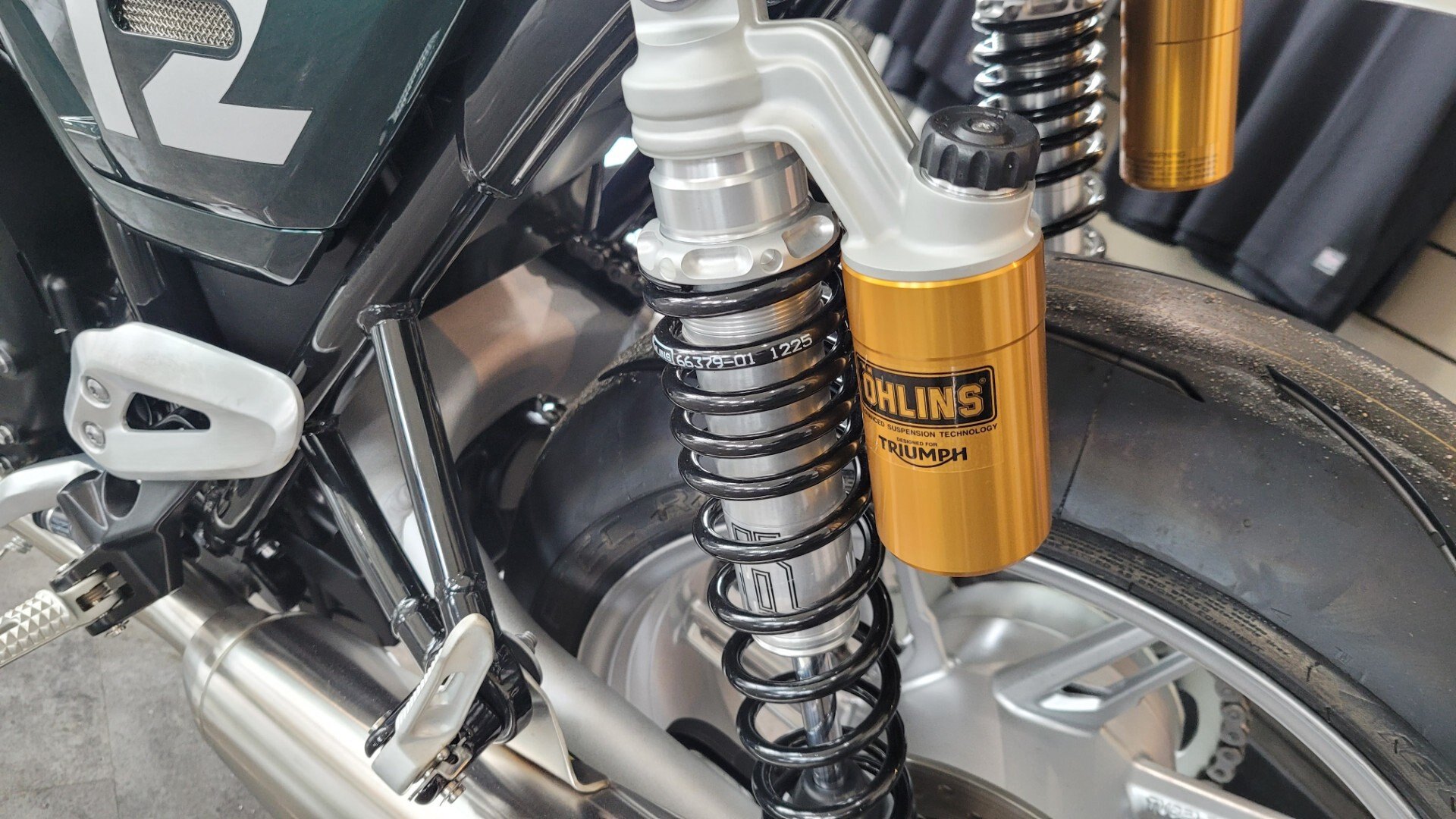 Rear Suspension Öhlins twin (RSUs) with external reservoirs, adjustable for pre-load, compression and rebound damping. 123 mm wheel travel